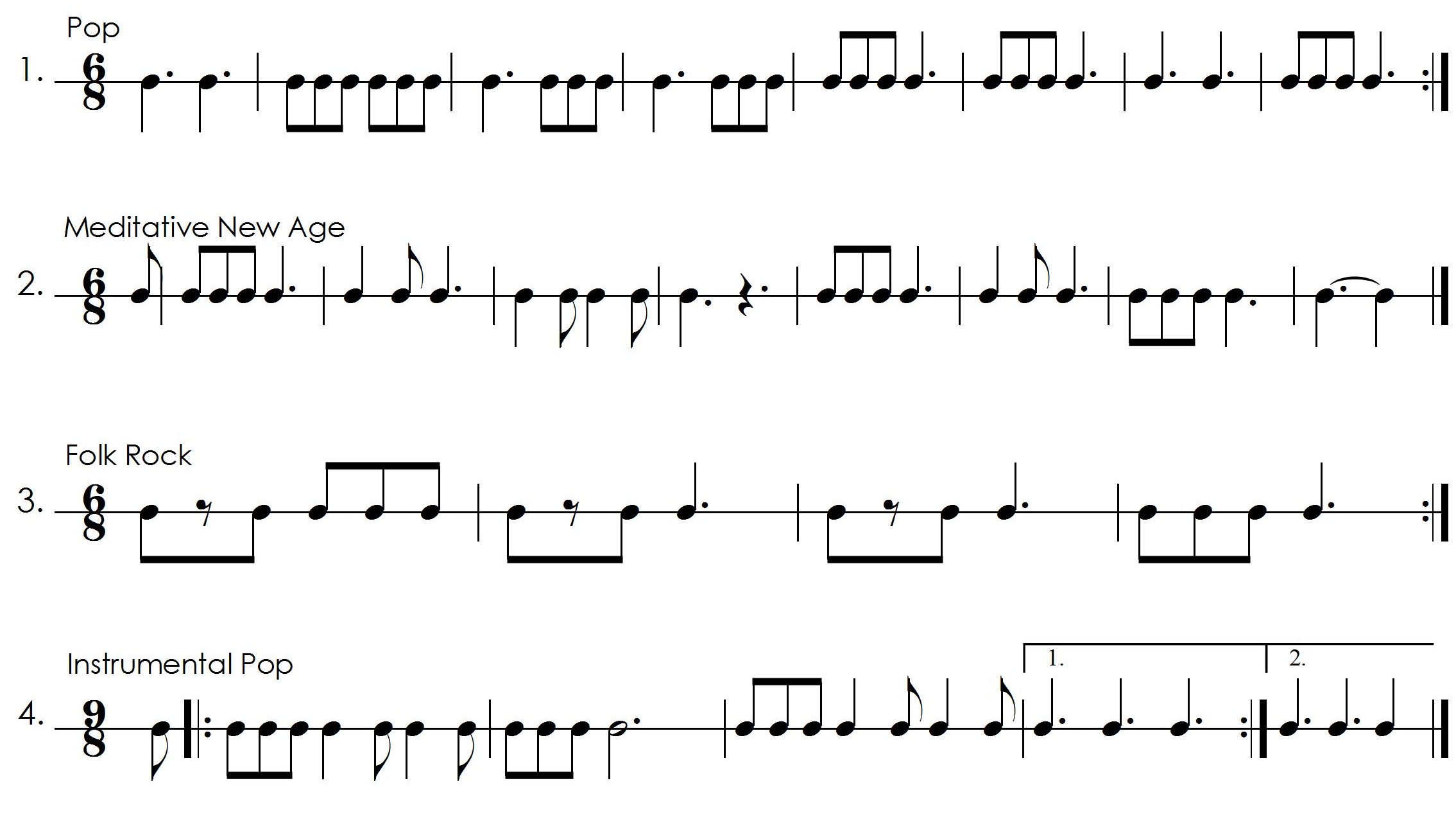 - Compound quadruple meter (12/8) has four primary beats, each divided into three smaller beats.