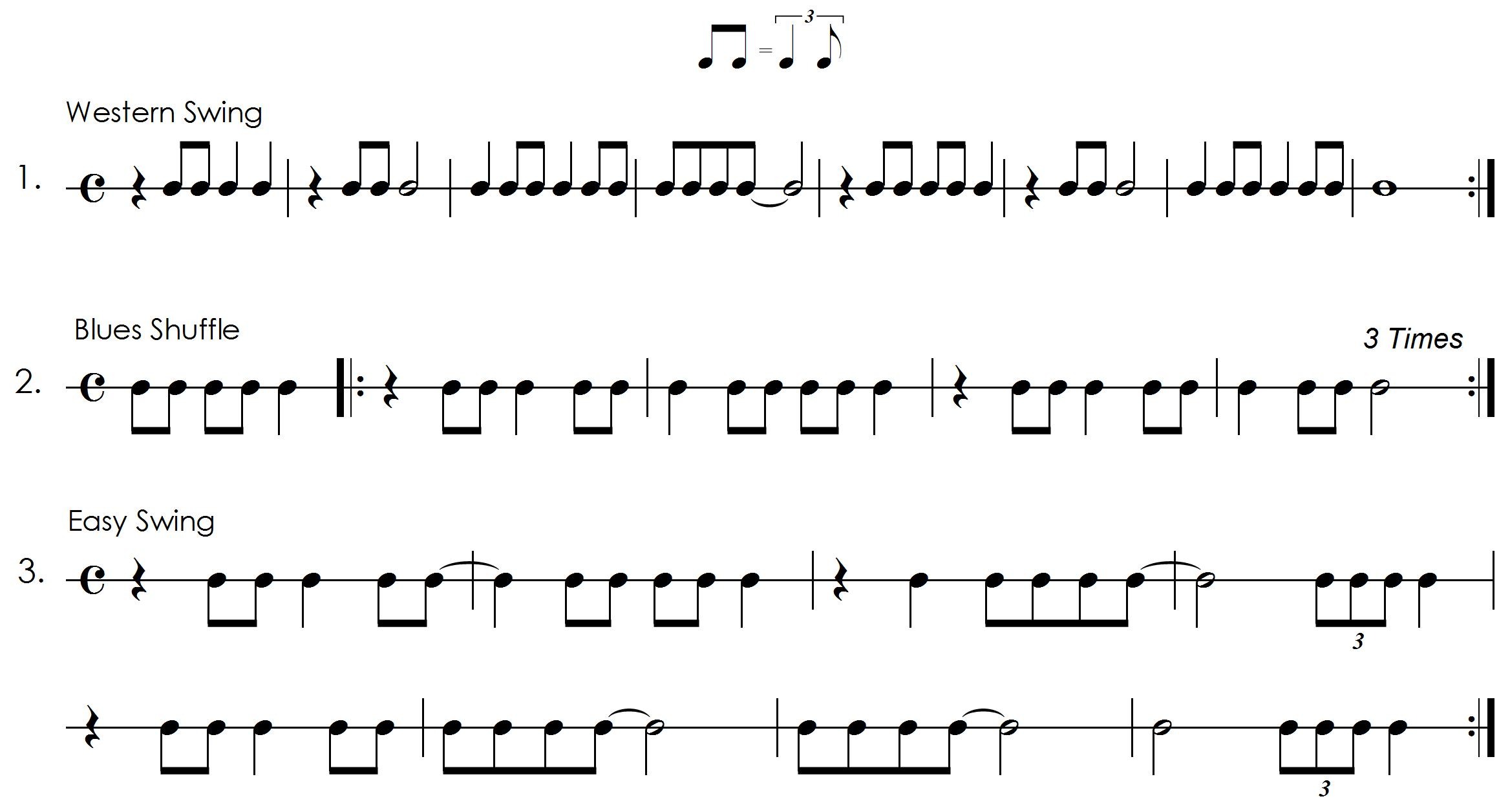 In many popular styles, including jazz and blues, it is customary to 'swing' the rhythm. That means that you will play the eighth notes unevenly, using a long-short rhythm.