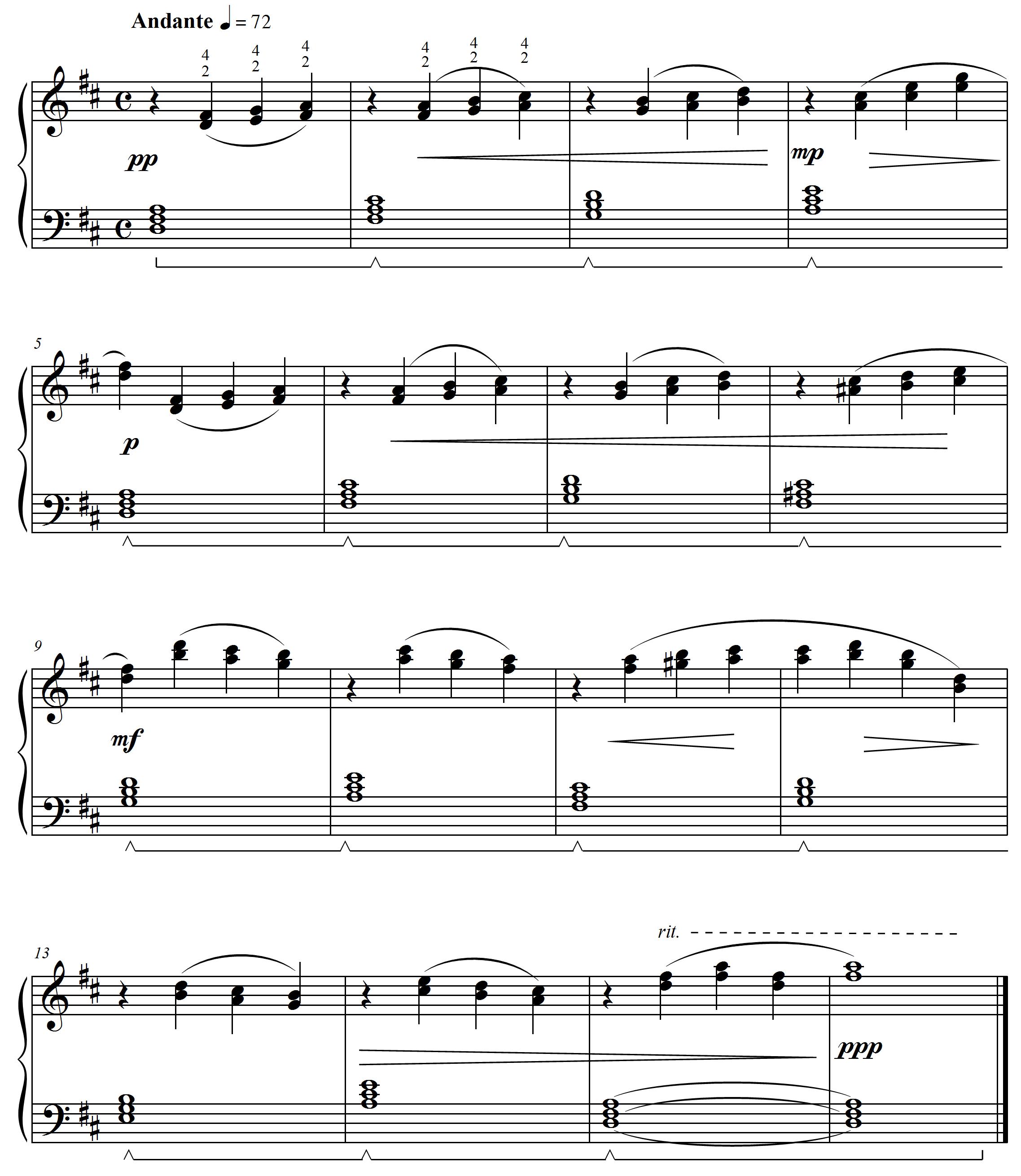 In Floating, your right hand uses only the 2nd and 4th fingers. Think about your hand "floating" above the keys as you move from one position to the next. The damper pedal will help to create the right atmosphere. Can you see how each group of slurred notes in the right hand melody relates to the triad accompaniment played in the left hand?